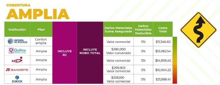 El de Quálitas, que ronda los 13 mil 082 pesos con 84 centavos; ANA Seguros, que oscila en 14 mil 838 pesos con 45 centavos; Banorte, cuya cantidad a pagar por el seguro con cobertura amplia es de 15 mil 004 pesos con 22 centavos; sin evadir a Zurich, por el que darías 21 mil 888 pesos con 41 centavos. ¿Te convence algún seguro para auto del listado?