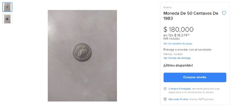 Una moneda de 50 centavos está acaparando la atención de los coleccionistas en un reconocido portal de compra y venta en Internet. ¿Cuál es la razón? Además de que es de 1983 y cuenta con un diseño muy llamativo, cuesta 180 mil pesos mexicanos. ¿Qué características tiene? Te lo contamos a continuación.