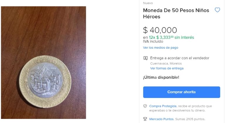 El propietario de esta moneda de 50 pesos, el cual radica en el estado de Morelos al interior de la República Mexicana, la vende a través de Mercado Libre, plataforma especializada que se ha vuelto experta en la compra y venta de artículos relacionados a la numismática. Para beneplácito de los interesados, el dueño está dispuesto a aceptar 12 mensualidades sin intereses de tres mil 333 pesos.