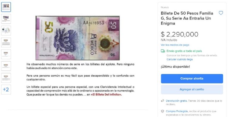 Un billete de 50 pesos está causando polémica en Mercado Libre. Además de que su monto supera los 2 millones de pesos, posee una peculiaridad detrás. Su vendedor advierte que tiene una característica, dentro de su número de serie, que lo vuelve diferente a cualquier otro ejemplar similar existente en el país.