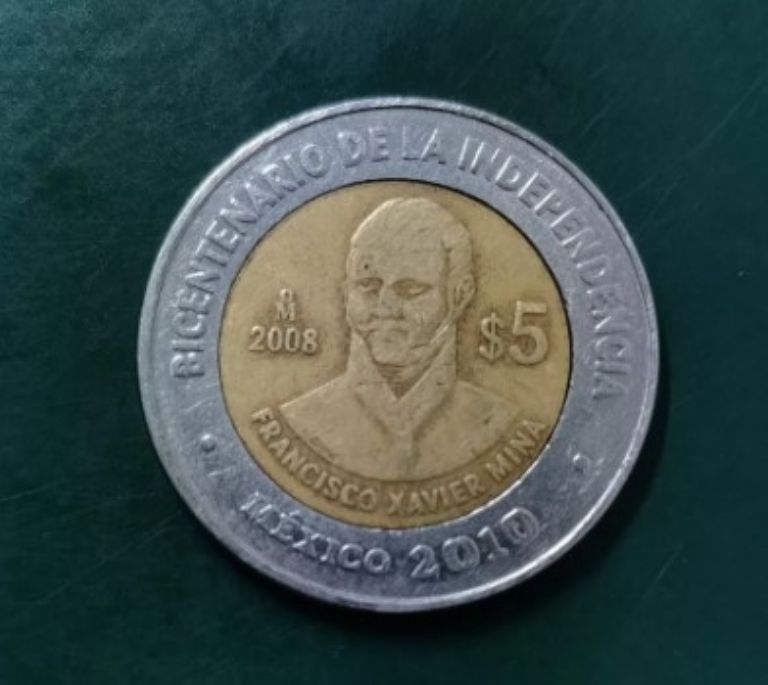 Esta moneda de 5 pesos fue puesta en circulación en 2008 y es conmemorativa del inicio de la Independencia de México. El español Francisco Xavier Mina es el que resalta en el anverso, en que lo acompaña el lema "Bicentenario de la Independencia México 2010". ¿La tienes en tu posesión?