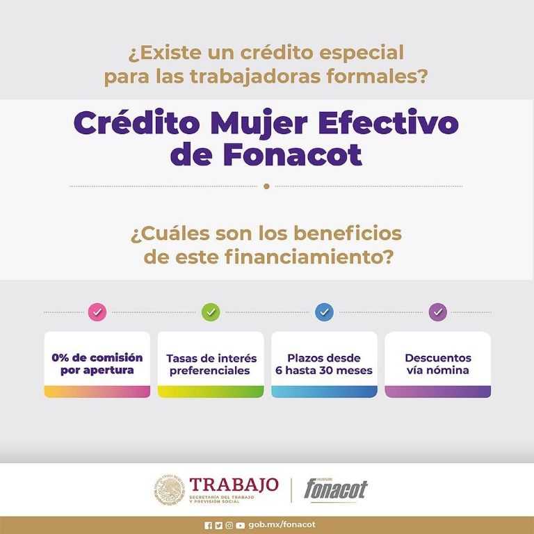 Con el fin no solo de proteger su patrimonio, sino incluso hacerlo crecer, Fonacot pone a disposición de todas las trabajadoras en la formalidad a lo largo y ancho del país este nuevo Crédito Mujer Efectivo para adquirir bienes de consumo duradero para elevar su calidad de vida y la de su familia, llegando a ser hasta cuatro veces el suelo mensual que suelen ganar.