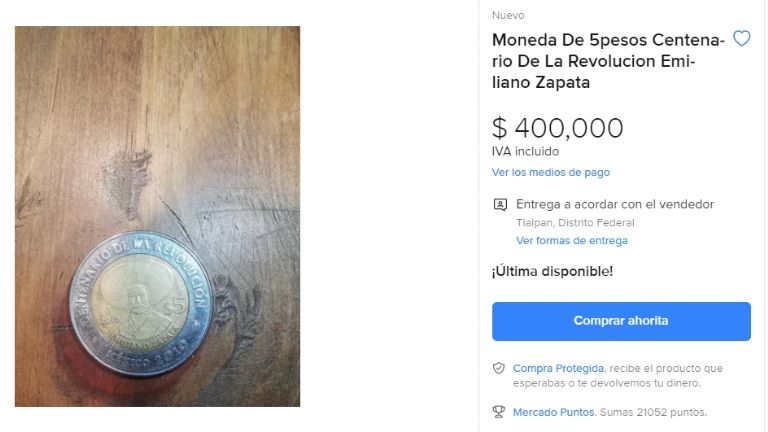 El artículo, que se publicó en la página especializada Mercado Libre y que tiene el mote de “Nuevo”, cuenta con un total de cuatro imágenes mismas en donde se observa esta moneda de 5 pesos por la que su dueño exige un mínimo de 400 mil pesos. Para convencer a los compradores, este tomó cuatro fotos tanto del reverso como del anverso del ejemplar.