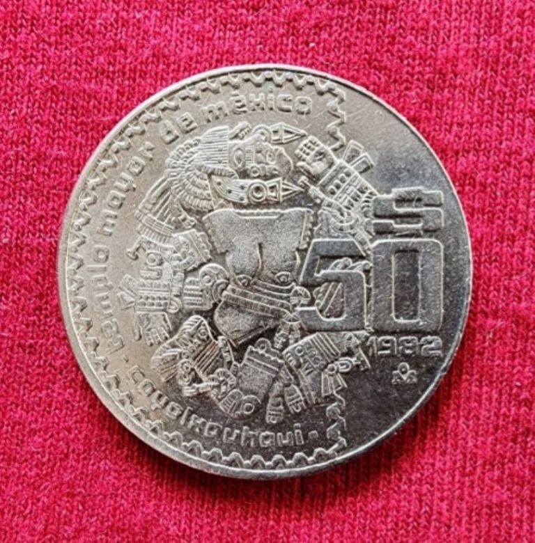 La moneda de 50 pesos en cuestión es antigua. Pertenece a la familia AA, que ya fue desmonetizada por el Banco de México (Banxico). No obstante, salió a circulación en 1982; es decir, hace 41 años. ¿Te habías olvidado de ella? Puedes reconocerla porque posee una greca y la iconografía de Coyolxauhqui, diosa azteca de la luna.