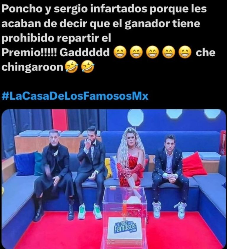 Por otro lado, Galilea Montijo les dijo a todos los finalistas que, el pacto que habían hecho sobre repartir el premio de los 4 millones de pesos a quien quedara ganador en La Casa de los Famosos, no era válida dicha opción, y las caras de preocupación más notorias fueron las de Sergio Mayer y Poncho de Nigris.