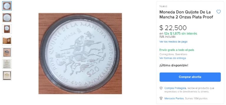 Una moneda de plata muy peculiar está causando diferentes impresiones en la web: la ofrecen en más de 20 mil pesos en una reconocida plataforma de compra y venta digital. Cuenta con el grabado de Don Quijote de la Mancha y aquí te presentamos algunas fotos para que la conozcas más a detalle.