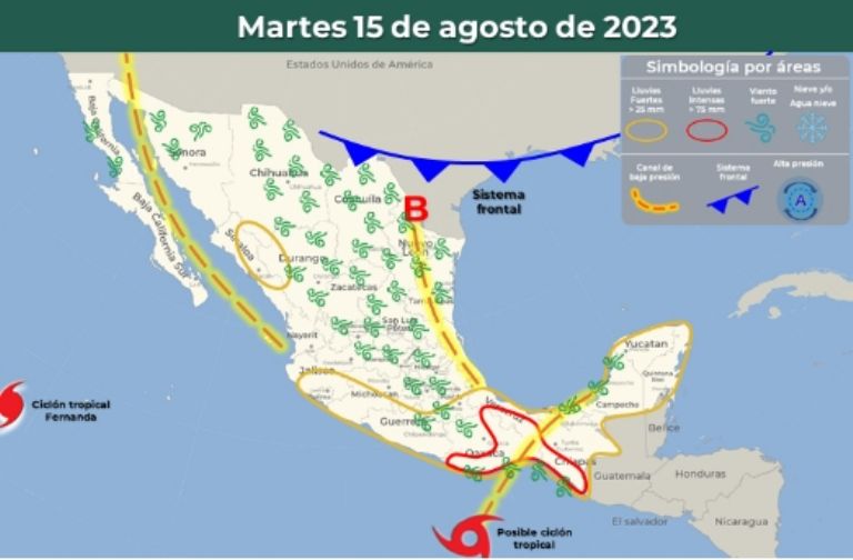 De acuerdo con información detallada por el portal del Servicio Meteorológico Nacional a través del Gobierno de México, estos 15 estados de la República sufrirán de lluvias fuertes e intensas derivadas de la Onda Tropical 22 y el Monzón Mexicano durante hoy martes 15 de agosto del 2023, por lo que es preciso tomar las precauciones correspondientes.