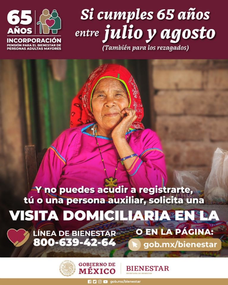 Mediante un comunicado, Ariadna Montiel, titular de la Secretaría del Bienestar, solicitó a todos aquellos que cumplan 65 años entre julio y agosto a acudir con estos requisitos y en estas fechas a cualquiera de los 2 mil 133 módulos de la Pensión Bienestar para registrarse de lunes a sábado de las 10 de la mañana hasta las 16 horas para recibir su apoyo de 4 mil 800 pesos bimestrales.
