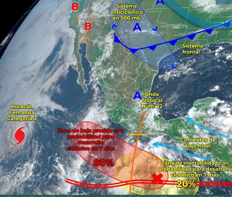 Mientras una circulación anticiclónica mantendrá el calor extremo con temperaturas máximas superiores a 40 grados sobre estos 8 estados, una zona de baja presión con probabilidad para desarrollo ciclónico asociada con la onda tropical 22 traerá consigo este miércoles 16 de agosto lluvias intensas en Oaxaca, Guerrero y Michoacán, así como lluvias fuertes a muy fuertes en el centro y occidente de México.