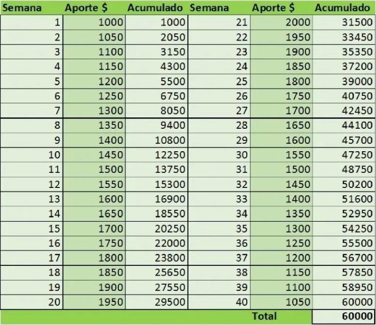 La idea de este reto de 40 semanas es comenzar a ahorrar un capital inicial de mil pesos, para semana con semana ir incrementando 50 respecto al monto anterior hasta llegar a 2 mil en la semana 21, para luego ir restando al monto pasado 50 pesos hasta terminar en mil 50 y con los 60 mil prometidos (checa la tabla).