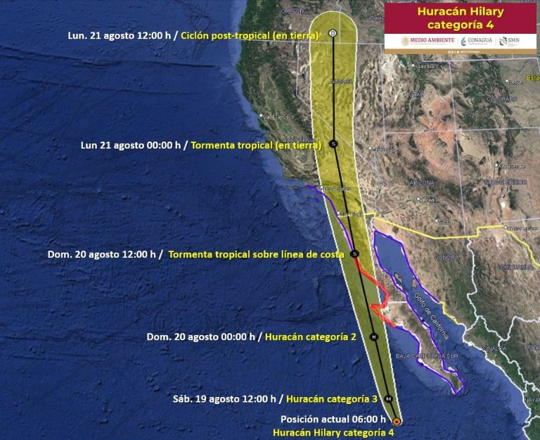 Hasta las 6 horas de este sábado 19 de agosto, el huracán Hilary se mantenía como categoría 4, con sus extensas bandas nubosas afectando el clima en el occidente y noroeste del país, generando lluvias muy fuertes a intensas, así como fuertes rachas de viento y oleaje elevado, por lo que aquí les traemos su trayectoria en vivo para que puedas darle seguimiento.