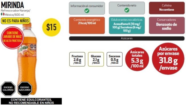 Por el mismo precio de Fanta, tendrías la posibilidad de consumir 600 mililitros de Mirinda. Pero, ¿Cuál es el costo verdadero según Profeco? Su composición es similar en ingredientes a la de su rival: sin cafeína, aunque con benzoato de sodio, Acesulfame K, Sucralosa y jarabe de maíz de alta fructosa.