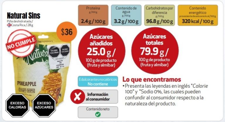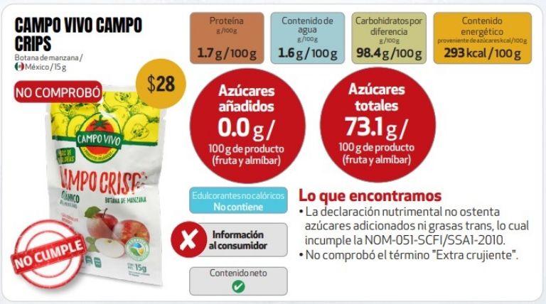 La Profeco manifestó que Campo Vivo Campo Crips, botana de manzana; y Green Soil Foods, de mango y piña, incumplen con la NOM-051-SCFI/SSAI-2010 porque su declaración nutrimental no ahonda en azúcares adicionados y grasas trans. En suma, que Señor Mango infringe con la misma ley porque no brinda detalles de razón social, domicilio fiscal y leyenda de país de origen.