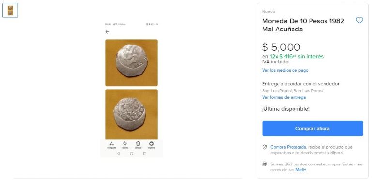 Una moneda de 10 pesos está acaparando los reflectores de Mercado Libre, plataforma de compra y venta en que ejemplares de este tipo suelen ser ofrecidos en Internet. No sólo porque cuesta 5 mil pesos, sino que también es antigua y posee un error de acuñación que la hace muy especial.