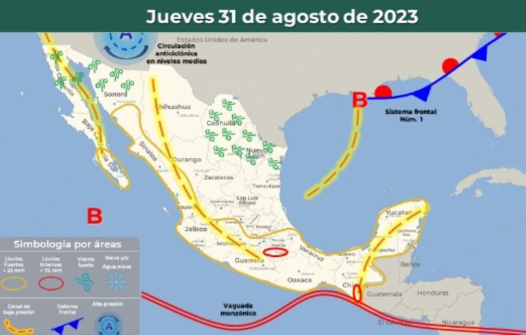 De igual forma, y así como ocurre con el Monzón Mexicano, el país sufrirá los efectos de los canales de baja presión durante este jueves 31 de agosto del 2023. Los pronósticos garantizan que el ingreso de humedad desde el Mar Caribe y la proximidad de la vaguada monzónica podrían traer consigo un nuevo apartado de lluvias fuertes e intensas no solo en estados como Morelos y Veracruz, sino también en Puebla y Chiapas.