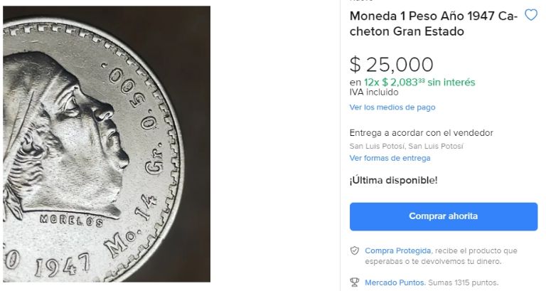 En el anverso aparece el perfil de José María Morelos y Pavón, mientras que en su anverso figura la leyenda de los Estados Unidos Mexicanos. Gracias a su peso de 14 gramos esta moneda de 1 peso, que se vende en Mercado Libre a través de un propietario que reside en el estado de San Luis Potosí, tiene un precio de 25 mil pesos.