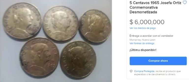 La Corregidora, personaje importante de la Independencia de México, tiene una moneda que fue puesta en circulación hace más de 50 años, la cual hace que esta sea muy difícil de conseguir. Su belleza estética y la poca facilidad para encontrar una parecida hace que su dueño exija hasta 6 millones de pesos en su publicación, la cual fue realizada en Mercado Libre.