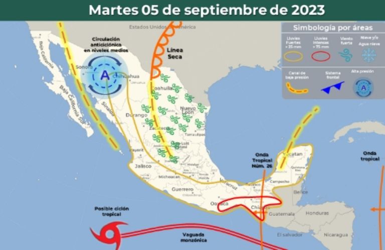 Y, por si la Onda Tropical 26 fuera poco, el país recibirá el Monzón Mexicano el cual continuará afectando al noroeste de la República a través de descargas eléctricas y fuertes rachas de viento en adición al ingreso de humedad que vendrá directamente del Mar Caribe, motivo por el cual tampoco se descartan las lluvias en esta parte del territorio nacional.