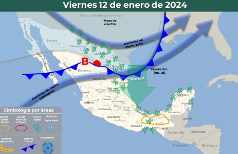 Finalmente, y gracias a su unión con una masa de aire frío, el Frente Frío 26 también tendrá la capacidad de propiciar un evento de Norte de corta duración en algunos estados como Veracruz y Tabasco, por lo que, además de las lluvias, los chubascos y la posible caída de nieve, tampoco se descartan mínimas y heladas de -15 grados en gran parte del país.