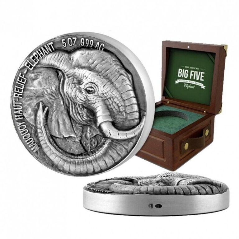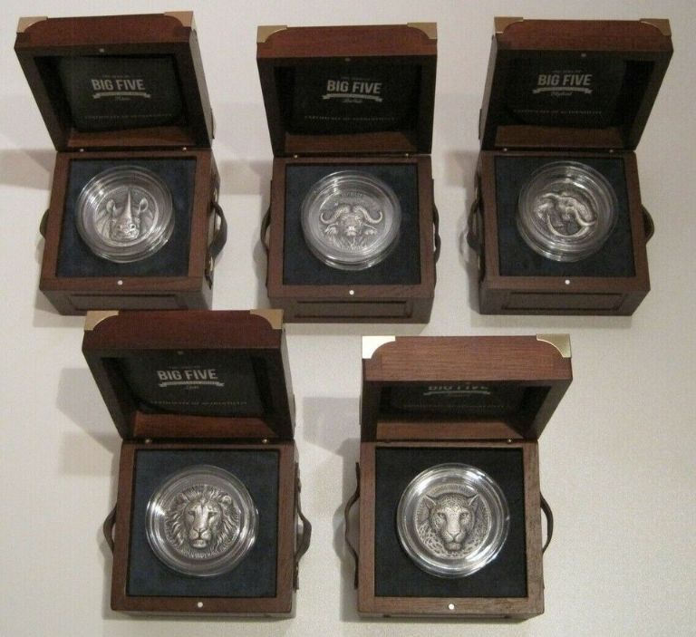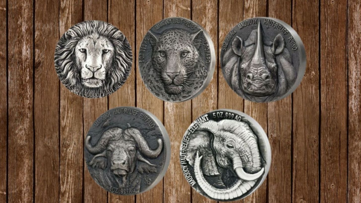 En ese sentido, un usuario en eBay ofrece una gran colección de 5 monedas de plata con distintos animales: león, leopardo, rinoceronte, búfalo y elefante, todas son originarias de Costa de Marfil, con valor nominal de 5,000 francos y un contenido de 5 onzas de plata pura ley 0.999 cada una.