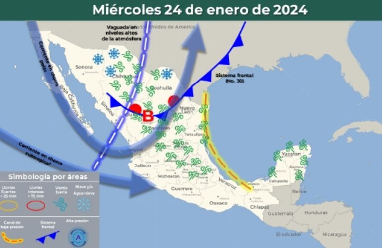 Según información detallada desde el Servicio Meteorológico Nacional y la Comisión Nacional del Agua, los estados que aquí conocerás serán los más lastimados debido a la llegada del Frente Frío 30 a través de sus lluvias y heladas de -10 grados a lo largo de este miércoles 24 de enero del 2024. ¡Toma tus precauciones al respecto!