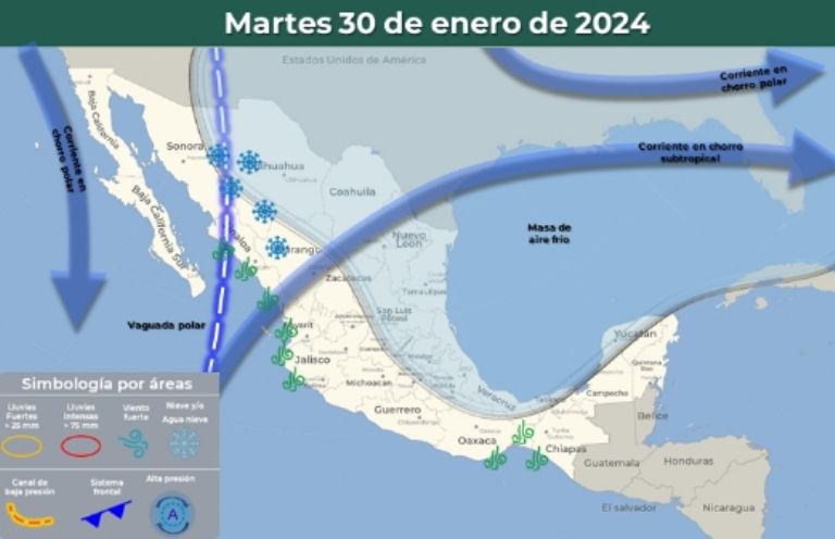 - Sonora, Durango y Chihuahua: Probabilidad de nieve o aguanieve a partir de la noche.