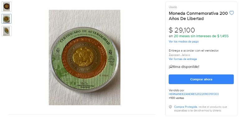 A diferencia de otros modelos disponibles en Internet, esta moneda conmemorativa de la Independencia de México ostenta un certificado de autenticidad; el hecho justificaría su valor aproximado 30 mil pesos. En realidad, la tasaron en 29 mil 100 pesos y podrías afianzarla a 20 meses sin intereses: con tal de brindar mil 455 pesos por cada 30 días.