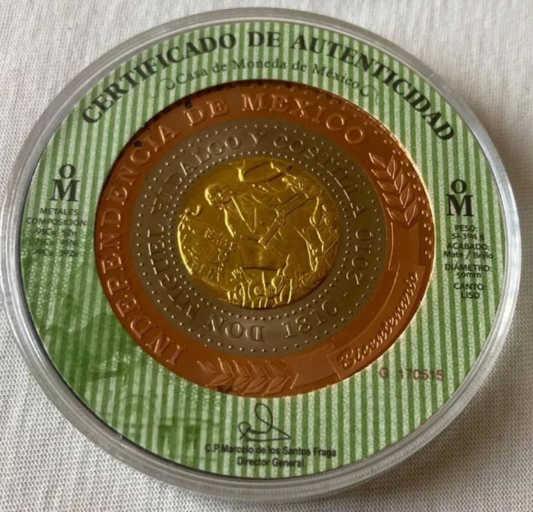 La moneda conmemorativa en cuestión corresponde a una pieza elaborada por la Casa de Moneda de México (CMM) y buscaba honrar el Bicentenario de la Independencia de México; por lo que fue puesta en circulación en 2010. Estaba resguardada por un estuche de madera para un par de piezas de 50 milímetros de diámetro.