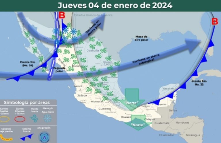 Según detalla el Gobierno de México a través del Servicio Meteorológico Nacional, los 9 estados que aquí se mostrarán resultarán realmente afectados por el Frente Frío 22 a través de sus lluvias y heladas durante este jueves 4 de enero del 2024, por lo que es fundamental seguir las recomendaciones de las autoridades correspondientes.
