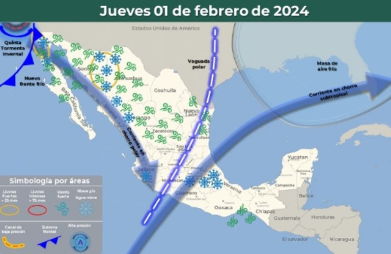 Esta quinta Tormenta Invernal dejará chubascos y fuertes rachas de viento en el norte del país. Finalmente, la vaguada polar que se extenderá sobre el centro, el noreste y el sur del territorio nacional ocasionará una nueva camada de lluvias, mínimas, heladas y la caída de nieve en varios municipios correspondientes a la República.
