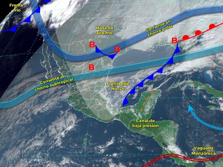 En interacción con un canal de baja presión, el frente frio 24 se extenderá sobre el sur del Golfo de México y la Península de Yucatán, mientras que su masa de aire frío mantendrá el ambiente frío a muy frío sobre el occidente, centro y oriente del territorio nacional, con heladas durante la madrugada del lunes y temperaturas mínimas de hasta -15 grados en Chihuahua, Sonora y Durango; de -10 a -5 en Zacatecas, Coaguila y Baja California y de -5 a 0 en Sinaloa, Baja California Sur, Nuevo León, Aguascalientes, San Luis Potosí, Estado de México, Hidalgo, Tlaxcala, Puebla y Veracruz. En la Ciudad de México se esperan de 0 a 5, así como en Tamaulipas, Michoacán, Jalisco, Guanajuato, Morelos, Querétaro y Oaxaca.
