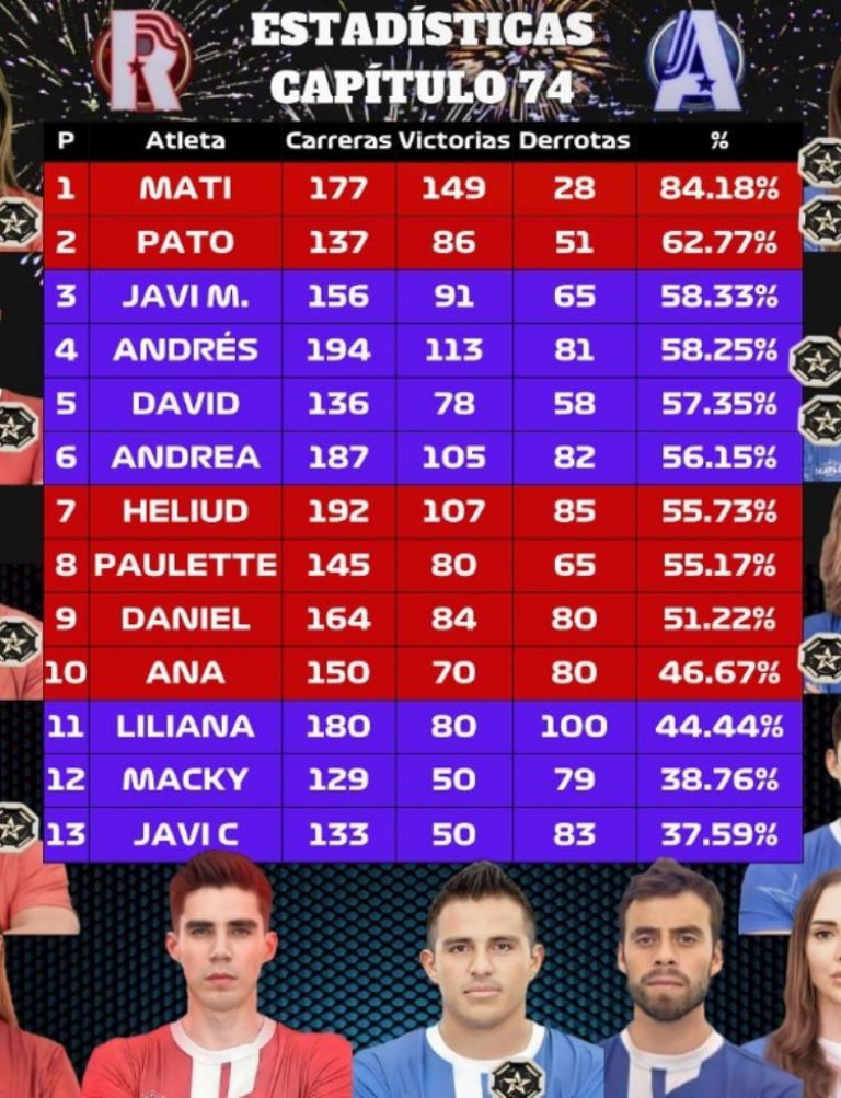 Después del capítulo 74 de esta séptima temporada la cuenta Recuento Exatlon ha arrojado una serie de estadísticas en la que se denota cómo es que ha sido la participación y desempeño de cada uno de los atletas de ambos equipos. Lo encabezan dos rojos: Mati y Pato, que aún con sus lesiones y problemas, prevalecen como los mejores competidores del reality contando con un 84.18% y 62.77% de triunfos.