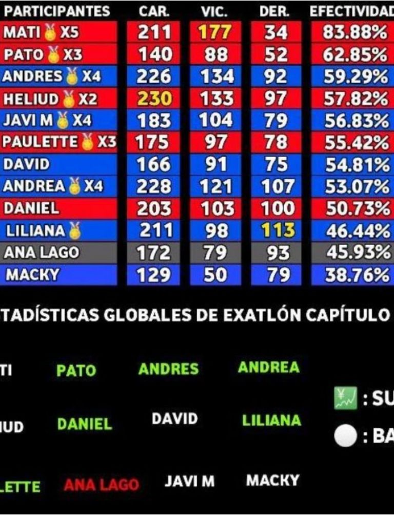 Con base a lo anterior, el equipo Azul sería el que esté más en riesgo de perder un integrante así es que para que sepas cuál ha sido el rendimiento de cada uno de ellos, te traemos las estadísticas de ellos, según la cuenta de Instagram Datos.examx.