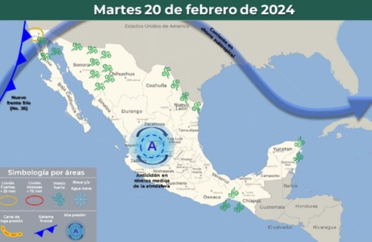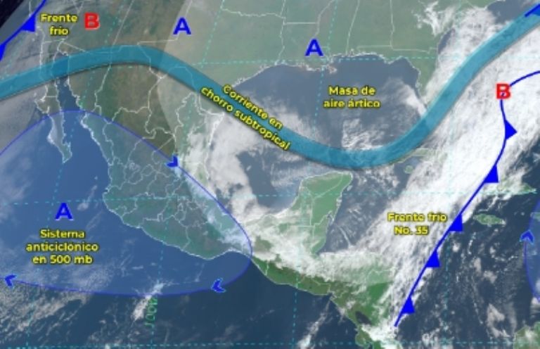Y, aunado al Frente Frío 36, el país también tendrá que lidiar con una circulación anticiclónica en niveles medios de la atmósfera sobre el occidente de la República Mexicana. Y si bien este punto podría provocar un ligero aumento en las temperaturas durante la tarde, en la mañana y la noche existirá la probabilidad de lluvias y heladas en varios puntos del país.