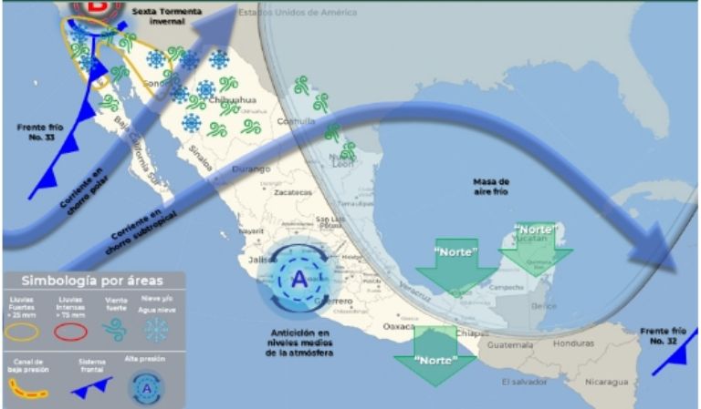 Finalmente, al Frente Frío 33 y la Tormenta Tropical se les unirá una masa de aire frío que atacará directamente a varios estados del país, motivo por el cual durante las mañanas y las noches se espera un cúmulo de lluvias, mínimas, heladas y posible caída de nieve y aguanieve en el territorio nacional durante este martes 6 de febrero.