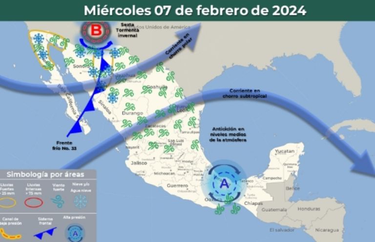 Debes saber que el Frente Frío 33 tendrá la capacidad suficiente para recorrer el norte del territorio nacional, por lo que este fenómeno de la naturales, aunado a la sexta Tormenta Invernal, tendrán la capacidad de generar un nuevo periodo de lluvias, chubascos, heladas y la posible caída de nieve y aguanieve en algunos estados.