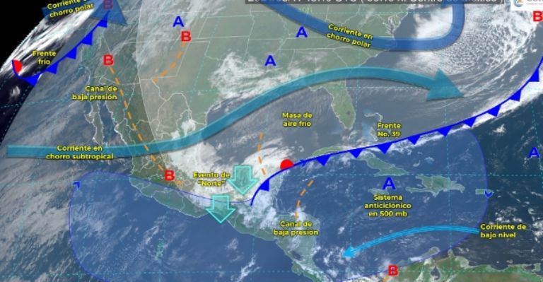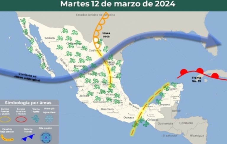 Y si bien durante la tarde el Frente Frío 39 podría dejar de afectar al país, un canal de baja presión que ingresó desde el sureste del país, en adición a un ingreso de humedad desde el Mar Caribe y el Golfo de México, propiciarán un nuevo periodo de lluvias y chubascos tanto en el oriente como en el sureste del territorio nacional.