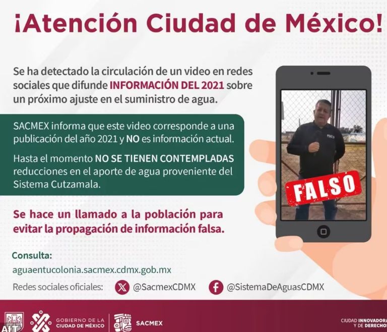Eso, en respuesta a un video que circula en redes sociales en el que se afirma que, presuntamente, se llevaría a cabo un corte masivo de agua, lo cual es falso pues no se ha dado a conocer que habrá falta de este importante líquido en ninguna de las alcaldía de la CDMX ni municipios mexiquenses, por lo que todos los ciudadanos pueden estar tranquilos, aunque sin pensar en desperdiciar sobre todo este Sábado de Gloria, pues habrá detenciones y se impondrán fuertes multas a quienes lo hagan.