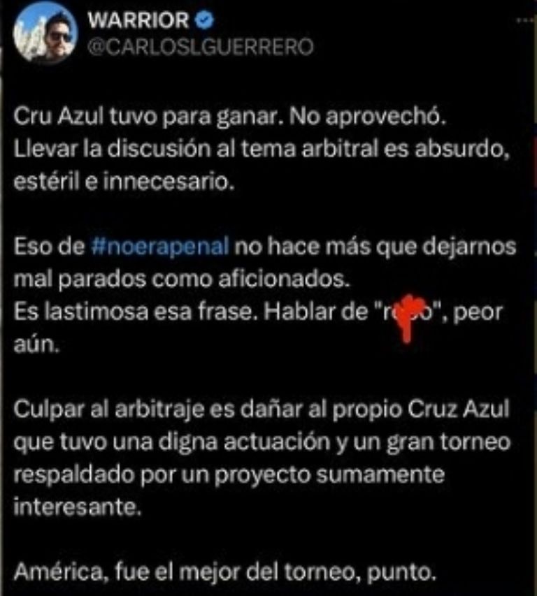 “Cruz Azul tuvo para ganar pero no aprovechó, llevar la discusión al tema arbitral es absurdo, estéril e innecesario. Eso del #noerapenal no hace más que dejarnos mal parados a todos los aficionados. Es lastimosa esa frase. Hablar de “robo”, peor aún. Culpar al arbitraje es dañar al propio Cruz Azul que tuvo una diga actuación y un gran torneo respaldado por un proyecto sumamente interesante. América fue el mejor del certamen, punto”, escribió el Warrior en su cuenta oficial de X.