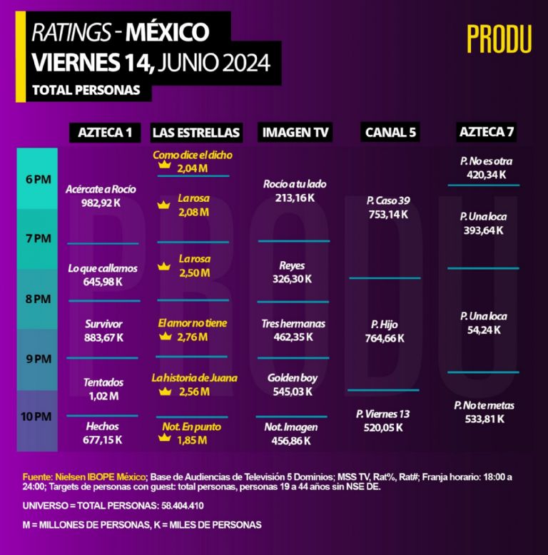 Tentados por la Fortuna se convirtió en el programa más visto de TV Azteca el viernes 14 de junio con 1.02 millones de televidentes. El reality show conducido por Sergio Mayer todavía ocupa la cima en la lista de popularidad de Azteca Uno. En segundo lugar estuvo el talk show Acércate a Rocío, el cual superó al viernes de eliminación de La Isla 2024 con 982 mil 920 espectadores. Hasta el tercer puesto apareció la competencia celebrada en Grecia y Turquía.