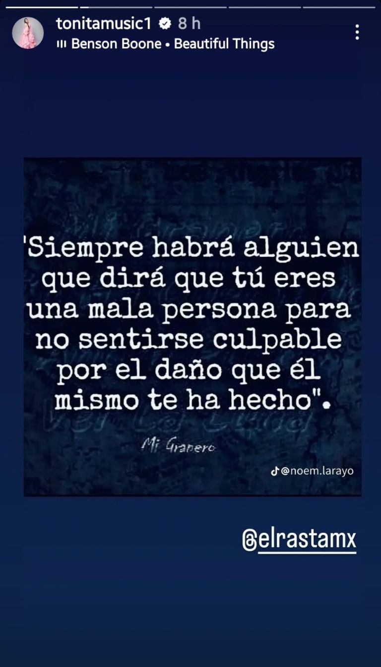 “Siempre habrá alguien que dirá que tú eres mala persona, para no sentirse culpable por el daño que él mismo te ha hecho”, fue el contundente mensaje que Toñita le etiquetó a Rasta en sus historias de Instagram y que va dirigido directamente contra sus excompañeros, a algunos de los cuales culpa no solo de lesionarla, sino incluso de hacerlo de manera malintencionada.