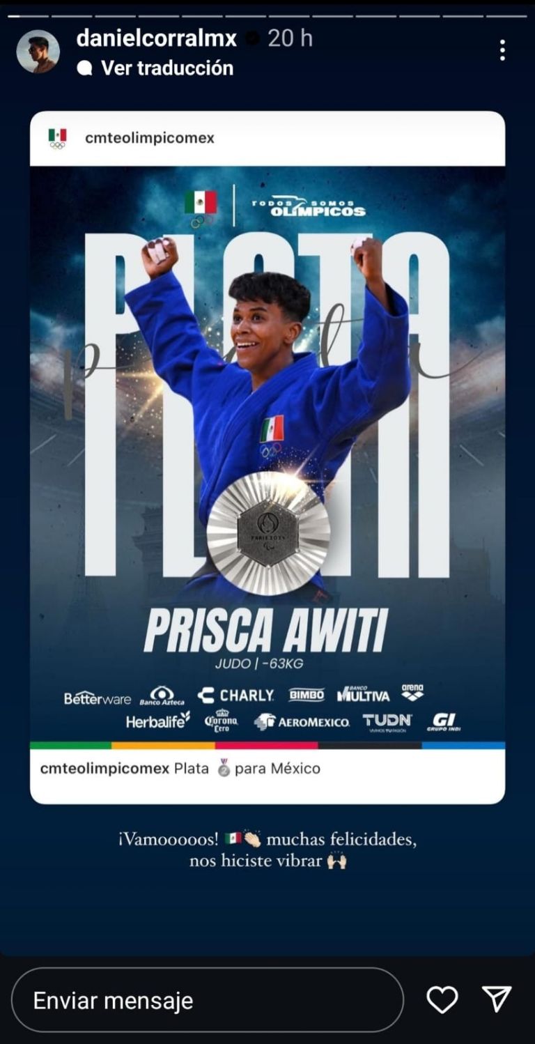 Fue así como Daniel Corral se unió a la gran cantidad de mexicanos que se rindieron ante Prisca Awiti y le mandaron un emotivo mensaje. El judo no figuraba como uno de los deportes con promesa de medalla, sin embargo, la atleta tricolor dio la gran sorpresa y llenó de alegría a todo el país.