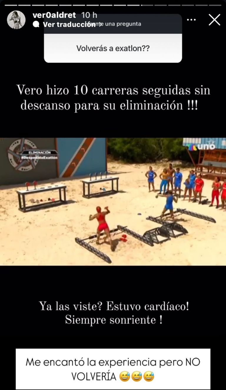 Pese a que no quiere saber nada del programa, Verónica Aldrete reconoció que Exatlón México fue una gran experiencia en su vida, por lo que nunca se arrepentirá de haber vivido dicha experiencia.