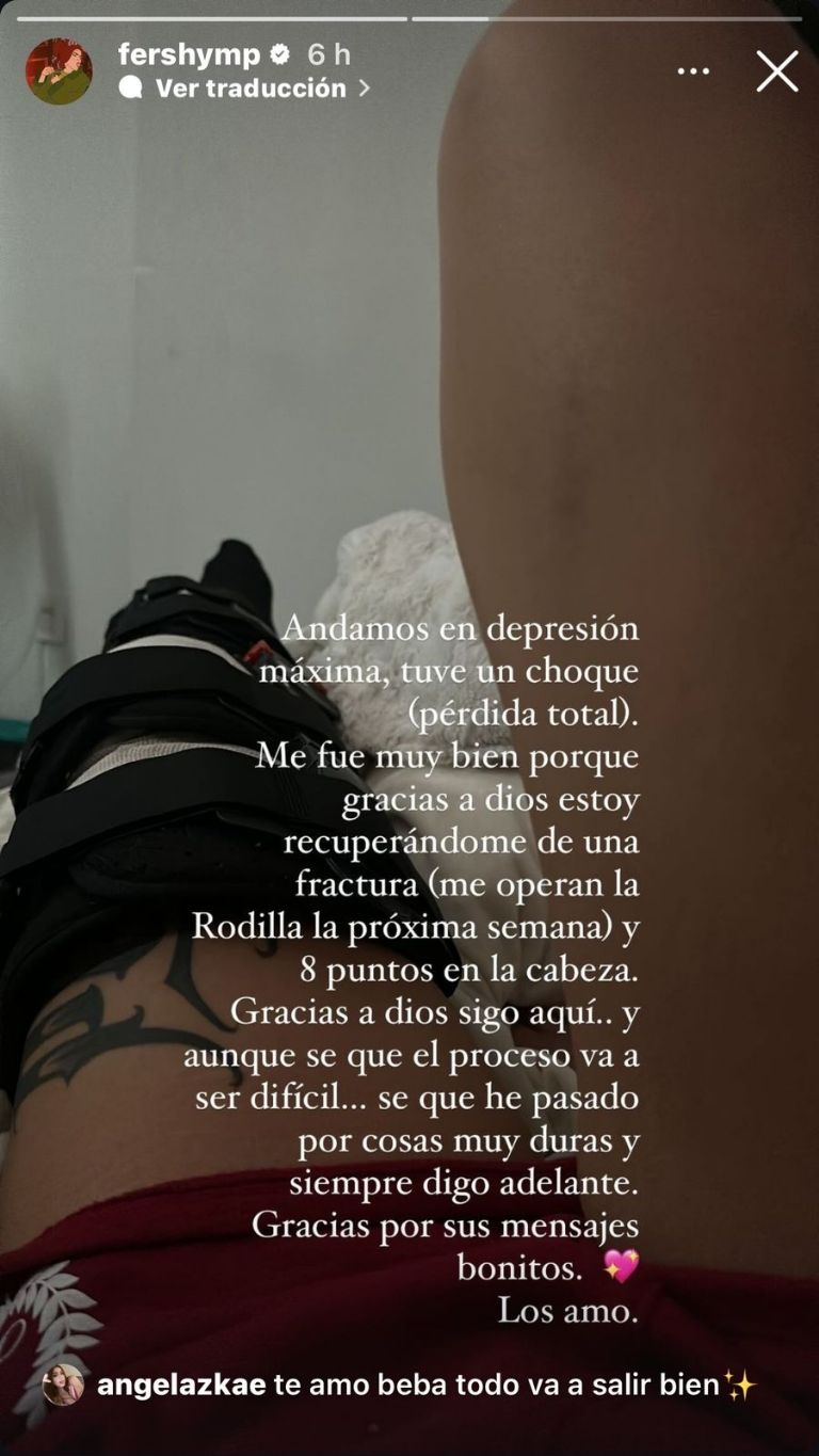 “Andamos en depresión máxima, tuve un choque (perdida total). Me fue muy bien porque gracias a dos estoy recuperándome de una fractura, y me operan de la rodilla la siguiente semana. Tengo 8 puntos en la cabeza y gracias a Dios sigo aquí. Aunque sé que el proceso será difícil, sé que he pasado por cosas muy duras y siempre sigo adelante. Gracias por sus mensajes bonitos, los amo”, escribió Fernanda Moreno en una historia de Instagram.