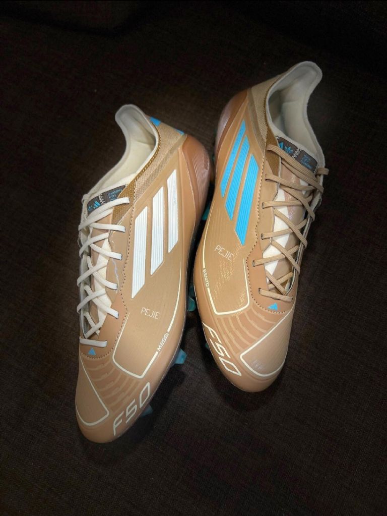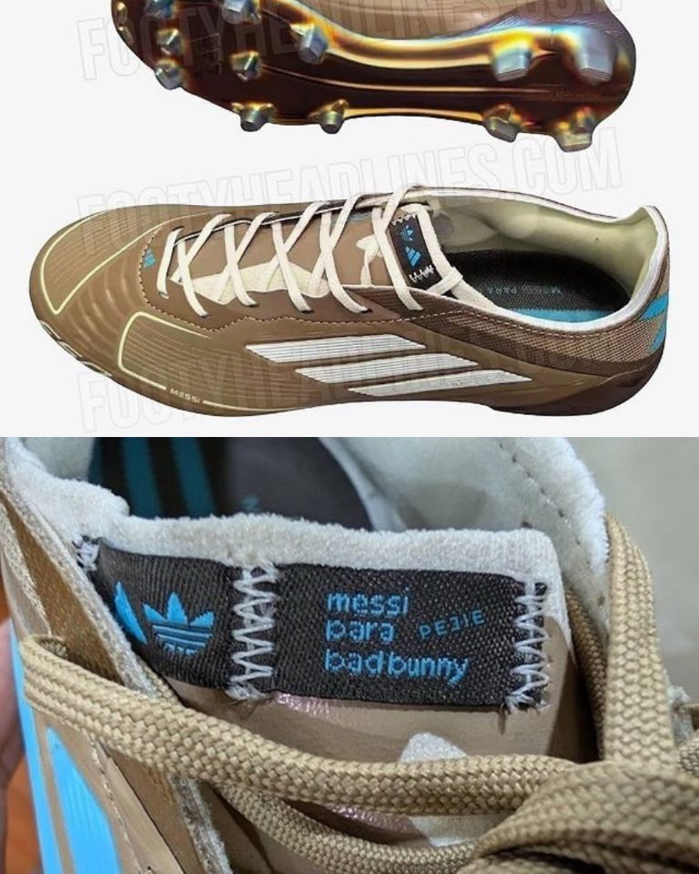 Se trata de un zapato de futbol en color dorado, acompañado de detalles turquesa y la etiqueta en la lengüeta con el grabado “Messi para Bad Bunny”, acompañado por los logotipos de Adidas y que está diseñado especialmente para el astro argentino, combinando su estilo deportivo de alta competencia con la estética urbana y vanguardista característica del reguetonero.