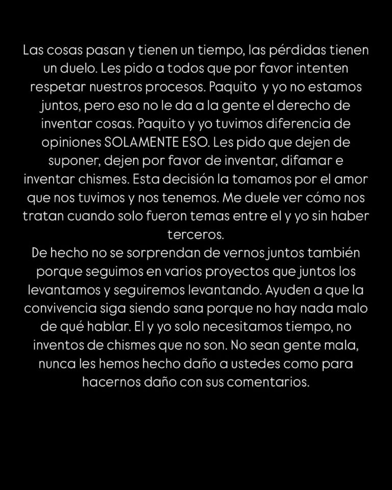 “Las cosas pasan y tienen un tiempo, las pérdidas tienen un duelo. Les pido a todos que, por favor, intenten respetar nuestros procesos. Paquito y yo no estamos juntos, pero eso no le da a la gente el derecho de inventar cosas”, fue lo que declaró Mafershof respecto a su supuesta infidelidad a Paquideus con Richard Sánchez, quien por su cuenta respondió: