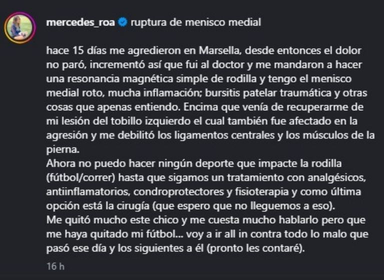 Destacó en el mensaje que compartió que presenta un fuerte problema de rodilla: menisco medial roto, por el cual incluso podría llegar hasta el quirófano si los tratamientos habituales no surten efecto. Asimismo, los golpes que recibió provocaron que se agravara una lesión de tobillo que venía acarreando.