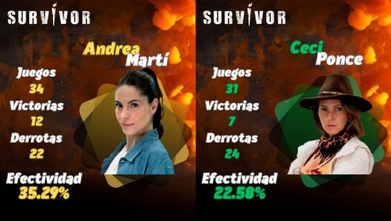 Andrea, a pesar de su esfuerzo, ha estado en riesgo de eliminación en varias ocasiones, cosechando 34 juegos, 12 victorias y 22 derrotas, teniendo un 35.29% porcentaje de efectividad. Mientras que Ceci, con su experiencia previa, no ha logrado destacar en esta edición del reality, con unos números de 31 juegos, siete victorias y 24 derrotas, obteniendo un 22.58% de tasa de rendimiento.